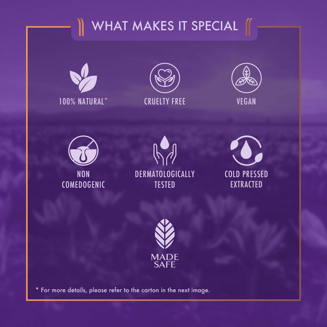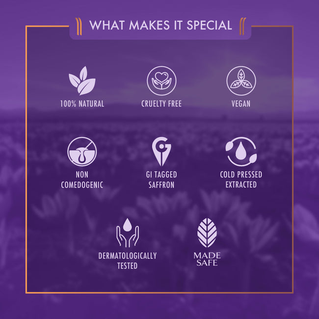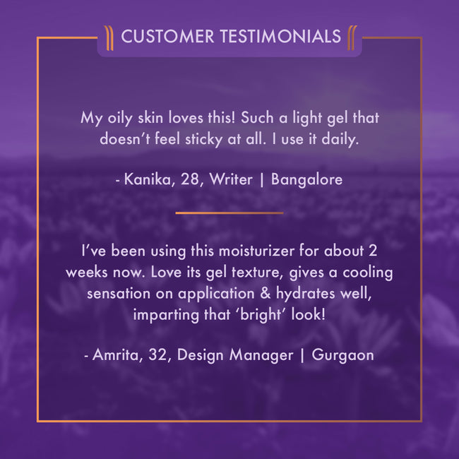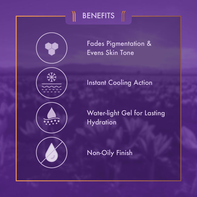 Kashmiri Saffron used in this Gel Moisturizer is highly potent with a Crocin content of 8.72%, much higher than that in Iranian Saffron which is 6.82%. Crocin is a natural antioxidant compound that controls melanin production and illuminates the skin.