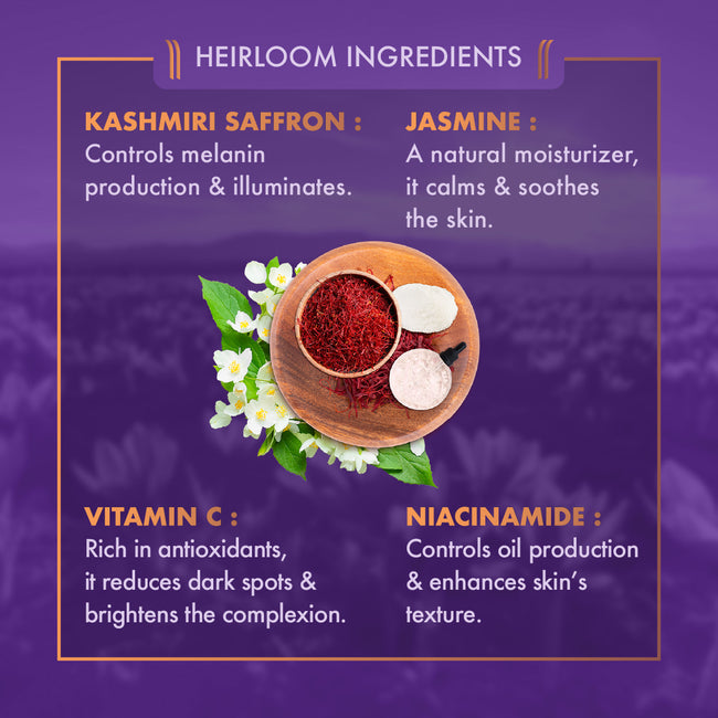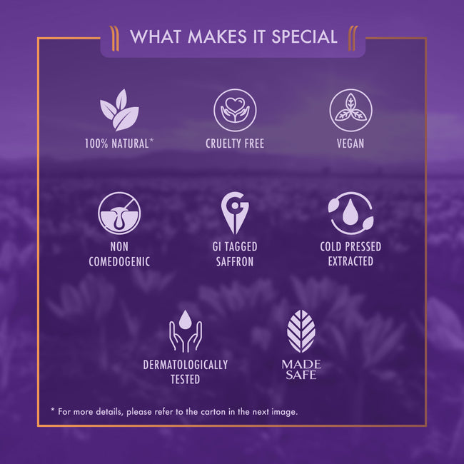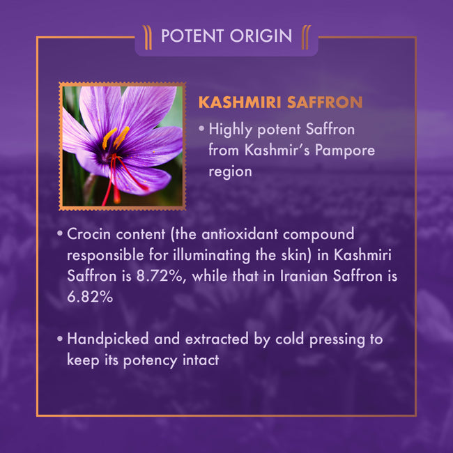 Kashmiri Saffron used in this Face Wash is highly potent with a Crocin content of 8.72%, much higher than that in Iranian Saffron which is 6.82%. Crocin is a natural antioxidant compound that controls melanin production and illuminates the skin.
