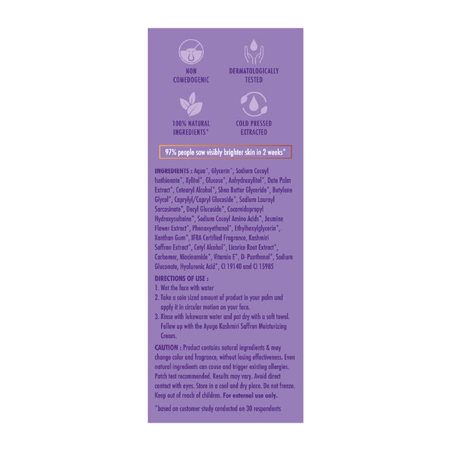 Prepared with highly potent ingredients, Ayuga Kashmiri Saffron Face Wash has all it takes to get deeply cleansed and glowing skin. It is made with A++ Mongra Grade Saffron, handpicked from Kashmir’s Pampore region, where it grows in its most potent form. Its gentle, gel-based formula cleanses the skin without stripping its natural moisture. Jasmine acts as a natural moisturizer that controls oil production and soothes the skin.
